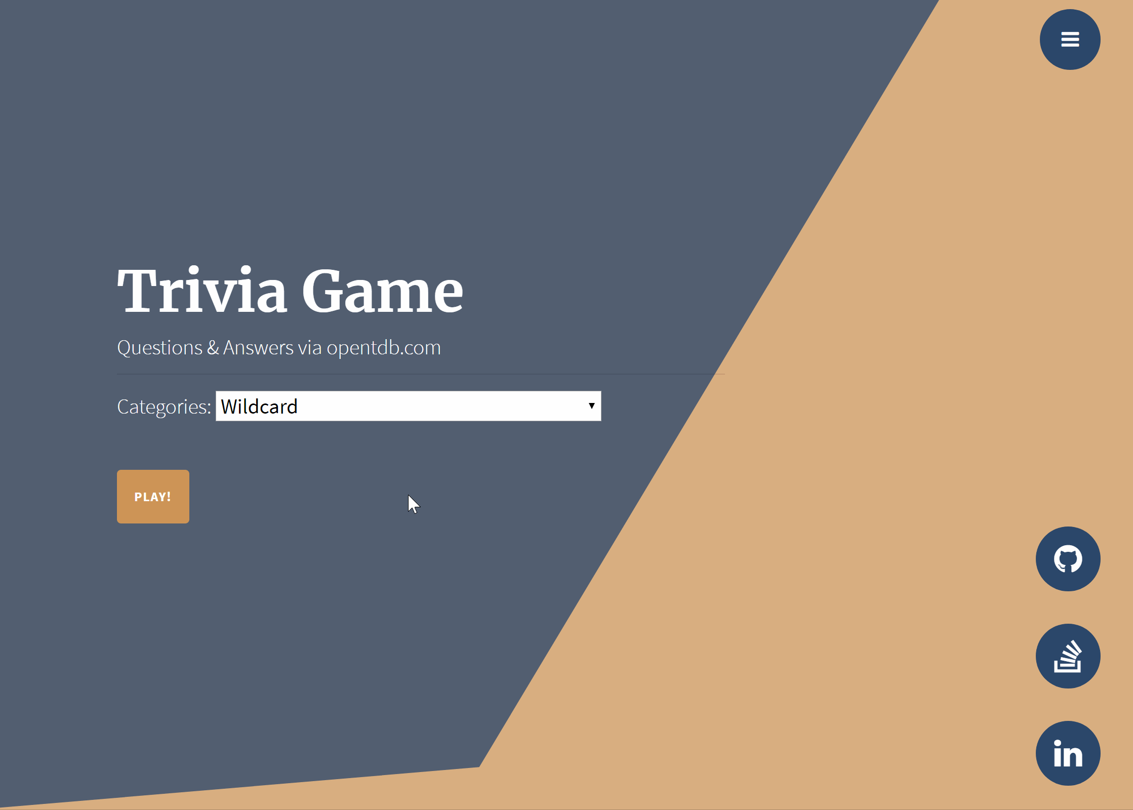 Player selects category and clicks 'play'. A timer counts down from 100 while a player tries to beat the clock and answer all questions correctly.
